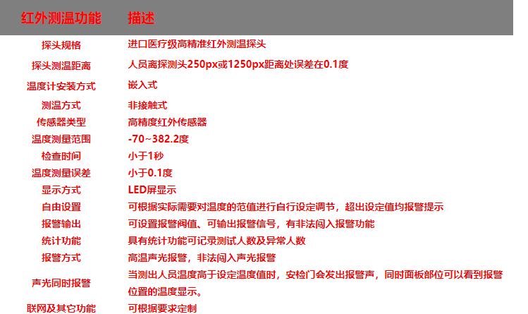 遠距離高精度人體測溫安檢門,集帶人體溫度檢測和金屬探測為一體的安全檢測門,門頭裝有高精度的體溫檢測探頭,探測角度可以上下移動, 能夠測量人體額頭的表面溫度,然后根據人體額頭的溫度與體溫的關系得到人體的實際體溫。檢測儀的光學組件將額頭發射和反射的能量匯集到傳感器上,通過電子組件將此信息轉化成溫度讀數并顯示在顯示面板上,當溫度讀數超過高溫報警值時,儀器會發出報警聲.報警溫度可隨意設置.具有防水、防火、防腐等特點。適用于管制刀具和槍支等危險品的安全檢查,廣泛應用于適用于機場,車站,出入境檢查站,等人員密集場所。是防止疫情擴散的有效手段。
