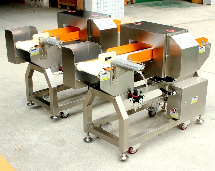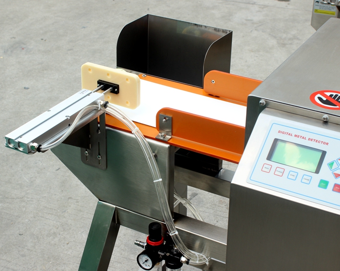 小包裝食品推桿式金屬檢測機,含有金屬異物的產(chǎn)品經(jīng)過探頭時會被發(fā)現(xiàn)并自動推掉。適合配套小包裝食品流水線生產(chǎn)使用。
